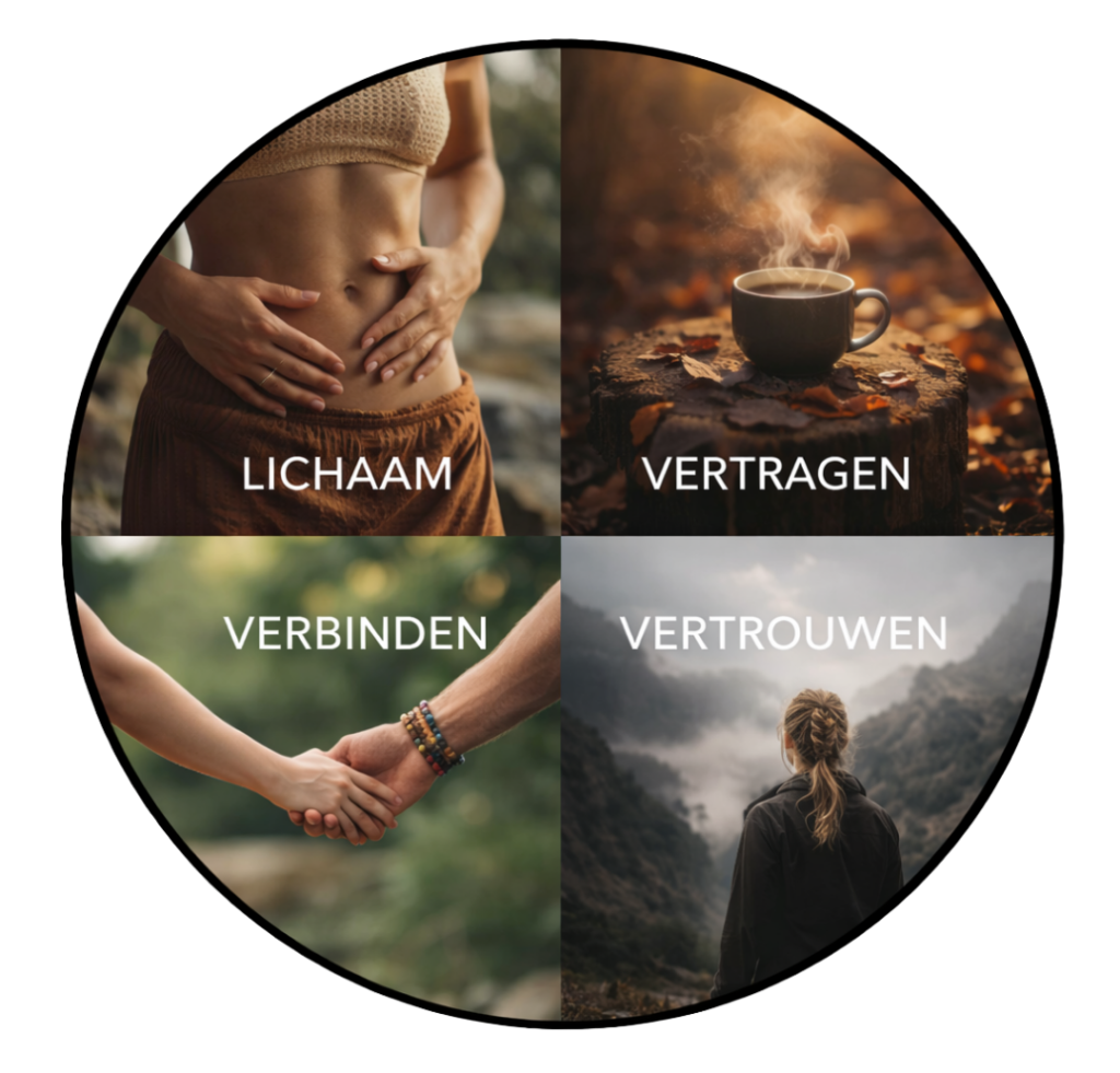 Elk element begeleidt een fase van het traject – niet als concept, maar als iets wat je voelt, beweegt en belichaamt.